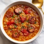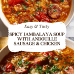 This Spicy Jambalaya Soup combines smoky andouille sausage with tender chicken thighs in a flavorful broth filled with vibrant vegetables and Cajun spices. It’s a comforting, hearty dish perfect for any occasion, delivering a taste of Louisiana in every spoonful.