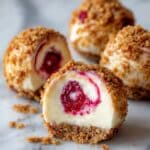 The image shows four small cheesecake balls on a white marbled surface. Each cheesecake ball has a thick crumbly light brown crust at the bottom and is covered with a crumb topping of the same color. The inside of the cheesecake balls is creamy white with a bright red swirl of raspberry sauce running through the center. One cheesecake ball is cut in half, revealing the smooth, creamy filling and the colorful swirl inside. The overall look is soft, crumbly, and rich. Photo taken with an iphone --ar 4:5 --v 7