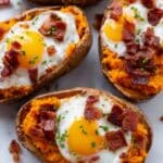 Keywords: Sweet Potato, Bacon, Egg Boats, Breakfast Recipe, Baked Sweet Potato, Savory Breakfast