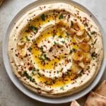 - Serve: Transfer hummus to a large serving plate. Use the back of a spoon to create waves or a well in the center. Spoon garlic-lemon oil into the crevices or well. Top with fried garlic and lemon zest, chopped parsley, and several shakes of paprika, sumac, or Aleppo pepper. Serve immediately or store chilled.