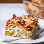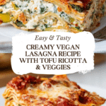 This perfect vegan lasagna recipe features a rich tomato sauce, creamy tofu ricotta, and smooth vegan béchamel layered with fresh vegetables and vegan cheese. It offers a plant-based twist on the classic comfort dish, baked to golden perfection with layers of tender noodles and vibrant zucchini, carrots, and spinach.