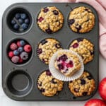 Keywords: Vegan muffins, apple muffins, berry muffins, healthy breakfast, oat crumble topping, dairy-free, egg-free, vegan baking