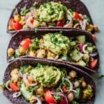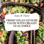 Enjoy these fresh and vibrant Vegan Ceviche Tacos with Guacamole featuring a zesty hearts of palm and chickpea ceviche salad marinated in citrus and miso dressing, topped with creamy homemade guacamole, all nestled in crispy baked corn taco shells. Perfect for a light, flavorful plant-based meal bursting with textures and bold flavors.