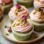 - Garnish: Sprinkle chopped pistachios over the frosting and optionally top each cupcake with a mini dried rose bud for an elegant finish.