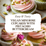 These Vegan Mini Rose Cupcakes are delicate, pastel-colored treats perfect for any occasion. Featuring a moist green pistachio-infused cupcake base and topped with a smooth pink rose-flavored vegan buttercream, these mini cakes combine elegant flavors and beautiful presentation using plant-based ingredients.