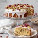 This Vegan Persian Love Cake is a fragrant and moist cake infused with rose water, cardamom, and nutmeg, featuring ground almonds and topped with a zesty lemon syrup and icing. Garnished with chopped pistachios and edible dried rose petals, it offers a delightful blend of floral and citrus flavors perfect for a special occasion or a comforting treat.