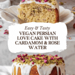 Keywords: Vegan Persian Love Cake, Persian cake recipe, rose water cake, vegan almond cake, cardamom cake, vegan dessert, floral cake