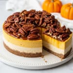 This rich and creamy Vegan Pumpkin Cheesecake is a delightful plant-based dessert perfect for autumn or any time you’re craving cozy flavors. It features a spiced ginger cookie crust and a smooth pumpkin-infused vegan cream cheese filling, baked in a water bath to achieve the perfect texture. Topped with a sweet and cinnamon-spiced pecan glaze, this cheesecake is a fantastic dairy-free alternative for festive occasions and everyday indulgence.