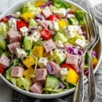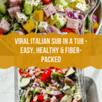 This Viral Italian Sub in a Tub is a quick, easy, and healthy salad-packed meal inspired by the classic Italian sub sandwich. Made using a veggie chopper to mince fresh vegetables, meats, and cheese into bite-sized pieces, this fiber-rich salad combines lettuce, cucumbers, peppers, onions, pickles, mortadella, pepperoni, and pepper jack cheese. Tossed with creamy avocado mayo, optionally olive oil, tangy apple cider or balsamic vinegar, and Italian seasoning, it’s perfect for a no-cook, grab-and-go lunch or meal prep. The recipe is naturally gluten-free and customizable for vegetarians and dairy-free diets.