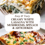 This gluten-free White Lasagna with Mushrooms, Spinach, and Artichokes is a rich, creamy, and savory casserole featuring layers of tender gluten-free pasta, a delicate mushroom cream sauce, and a flavorful cheese and vegetable filling. Perfect for a hearty vegetarian dinner, this lasagna combines sautéed mushrooms, fresh spinach, artichoke hearts, and a blend of mascarpone, Parmesan, and mozzarella cheeses baked to bubbly perfection.